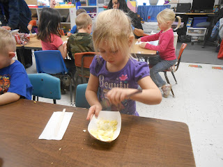 The children learned about the letter "E" this week. We read the story about Edgar Elf. He is one of Santa's Elves that took a vacation to the Emerald Zoo. While there, he stayed in an envelope outside the elephant enclosure, ate eggplant, and exercised. We decided today to make Edgar's egg salad sandwiches. Today was even more exciting for the morning class because KSDE sent Russ from Greenbush to video our cooking activity and Jeanie from the Child Food Program to interview Mrs. Montgomery. They will use this video in a nutrition tape that the Kansas State Department of Education is making. (I apologize not to have more morning pictures but didn't get our camera out while they were filming.)