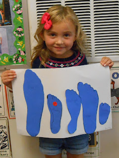 The children have been studying about families and homes. Families come in all sizes and configurations. The children's home work assignment was to trace around each family member's foot and bring the feet to school. They sorted and counted the different feet. Each child glued down his or her family member's feet from small to large. They really seemed to enjoy this assignment and to discover how big some of the daddy's and big brother's feet were.