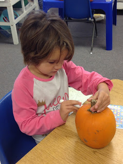 We talked about what is real and what is make believe this week. The children decided that monsters aren't real, but they really enjoyed the book, Go Away, Big Green Monster. We used their hand prints to make their own big green monsters. They also got to explore "real" pumpkins. We had some who literally started gagging when their hands touched the pulp. I had to rush one little person away from the table for fear of what might come next. They also got another pumpkin from the FFA group so they were able to decorate it.